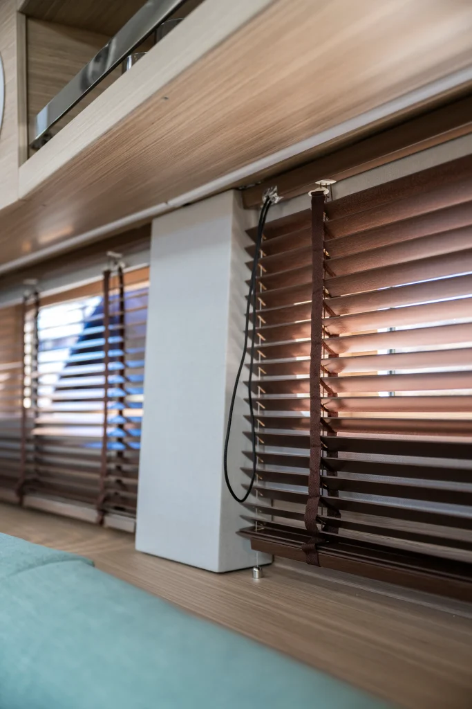Interni in Alpi rovere sabbia, Yanmar 110 cv, 3 cabine, 2 bagni, tessuti personalizzabili, delfiniera per attrezzatura Code 0, Pack Elegance, Pack Escape con doppio tavolo abbattibile in pozzetto, elica di prua, Pack Raymarine Offshore, upgrade plotter 12′, winch genoa elettrici, winch elettrici di manovra, aria condizionata in tutti gli ambienti, spray hood, bimini pozzetto e timoniere, serbatoio gasolio supplementare, wc elettrici, AIS Raymarine, VHF Raymarine doppia stazione, ponte, fondo pozzetto e piattaforma di poppa rivestiti in irodeck.