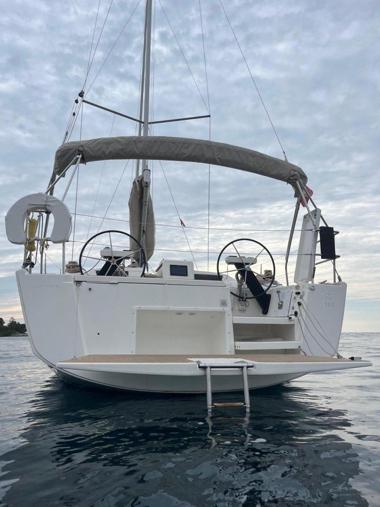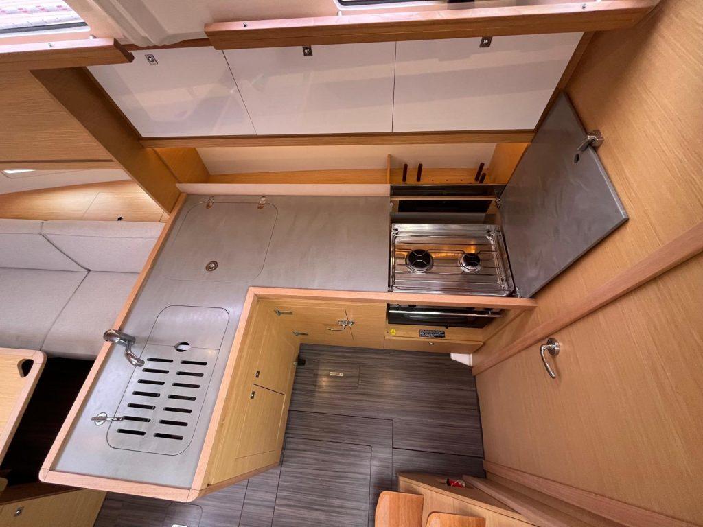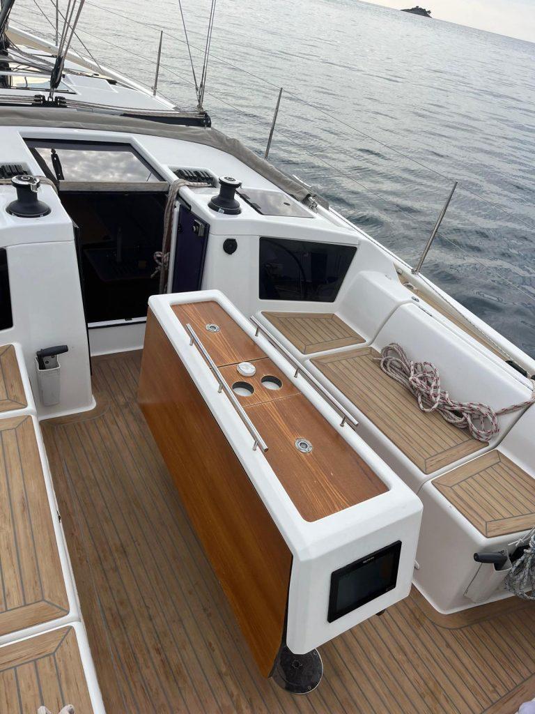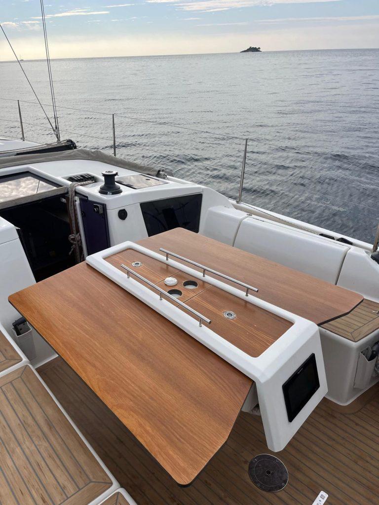 Ponte in teak sintetico, doccia pozzetto calda e fredda, randa steccata su carrelli, rotaia fiocco autovirante, genoa 108 %, sistema scotta randa alla tedesca, 4 winch di cui uno elettrico, Code 0 su delfiniera, spray hood, bimini, barbecue con lavandinoo in pozzetto.
