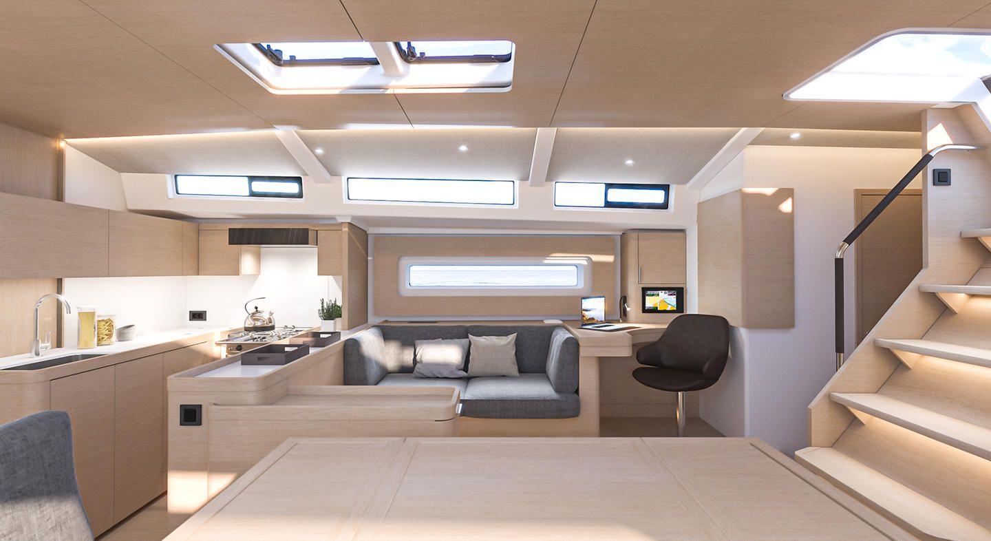 Disponibile con 3 cabine con 3 bagni, l’Oceanis Yacht 60 offre due finiture: noce e rovere chiaro . Le numerose parti in legno sagomate si fondono armoniosamente nelle grandi superfici laccate bianche, accompagnate da tappezzerie di alta gamma in un ambiente di raffinata eleganza.